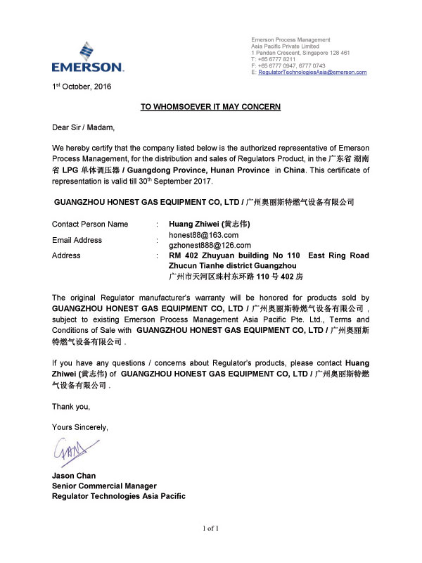 2020年度代理證書EMERSON艾默生/FISHER費希爾